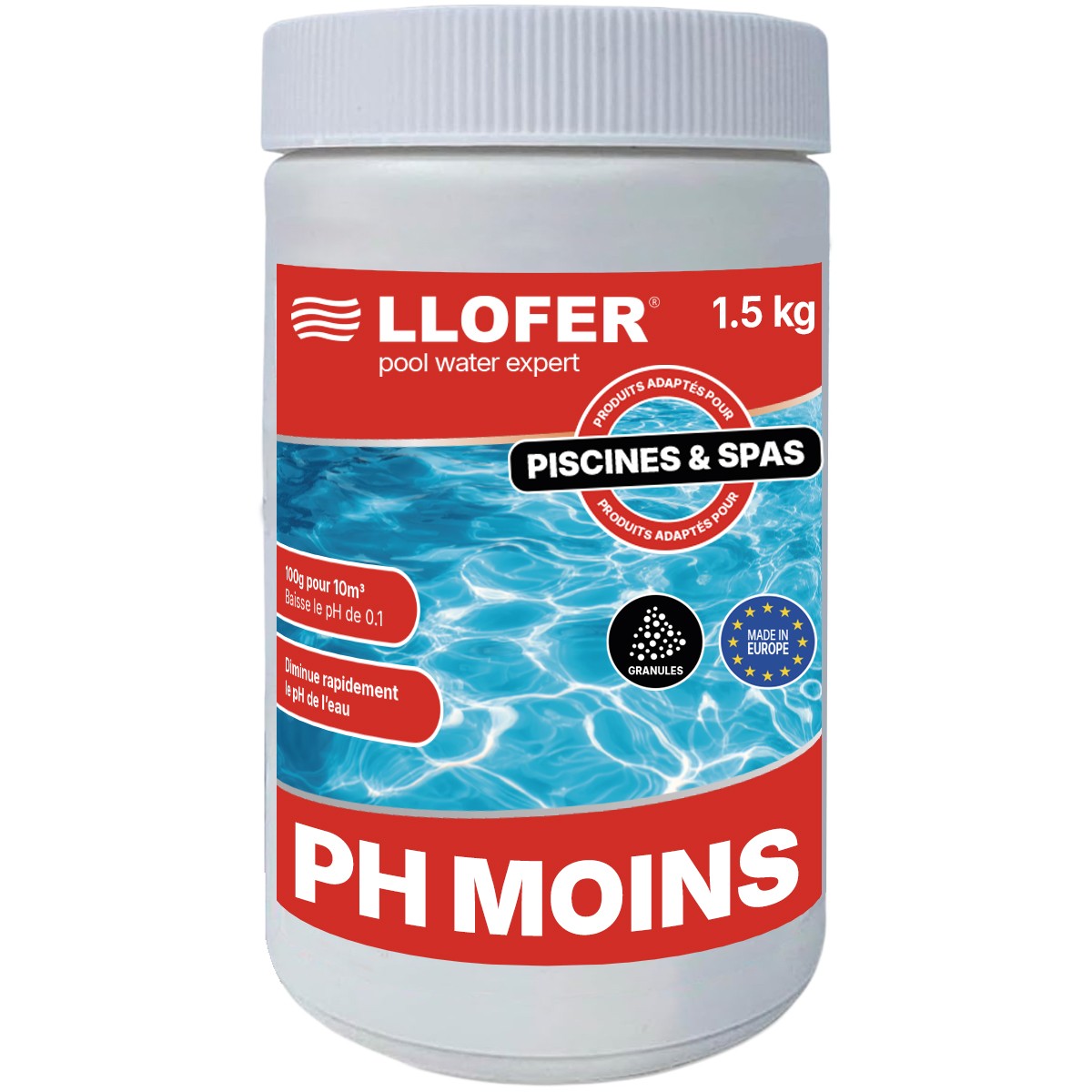 Le correcteur pH Moins LLOFER s’utilise en quelques gestes. Sa forme poudre se dilue facilement dans l’eau, sans dépôt. Il réduit efficacement le pH et restaure les conditions idéales de votre bassin.